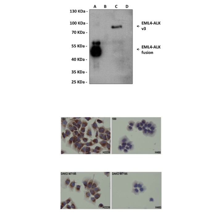 Top:Â Western Blot detection of ALK fusion protein expression using ALK-specific monoclonal (1B9) antibody.