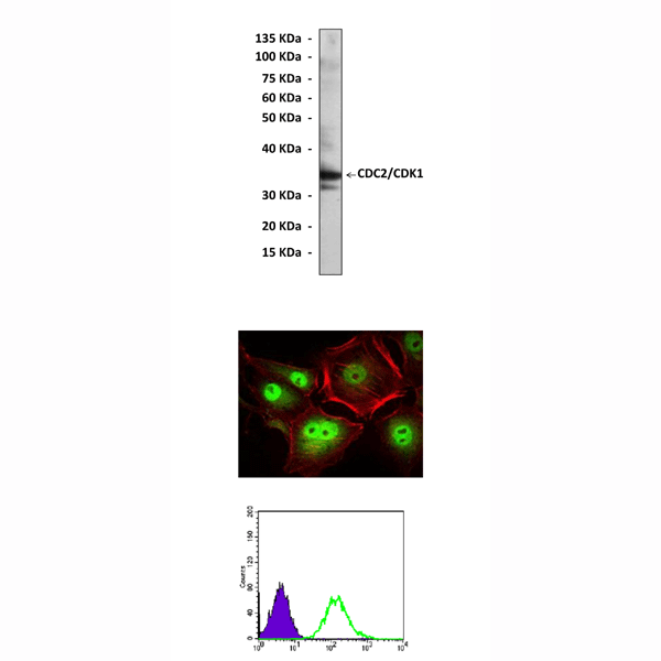 Top: Western Blot detection of CDC2/CDK1 proteins in Jurkat cell lysate using CDC2/CDK1 Antibody. Middle: This antibody stains HeLa cells in confocal immunofluorescent analysis (CDC2/CDK1 Antibody: Green; Actin filaments: Red; DRAQ5 DNA Dye: Blue).