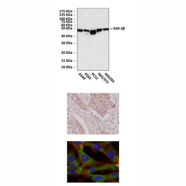 Top: Western Blot detection of GSK-3 beta proteins in various cell lysates using GSK-3 beta Antibody. Middle: This antibody stains paraffin-embedded human breast cancer tissue in immunohistochemical analysis. Bottom: It also stains NIH3T3 cells in confocal immunofluorescent testing (GSK-3 beta Antibody: Green; Actin filament: Red; DRAQ5 DNA dye: Blue).