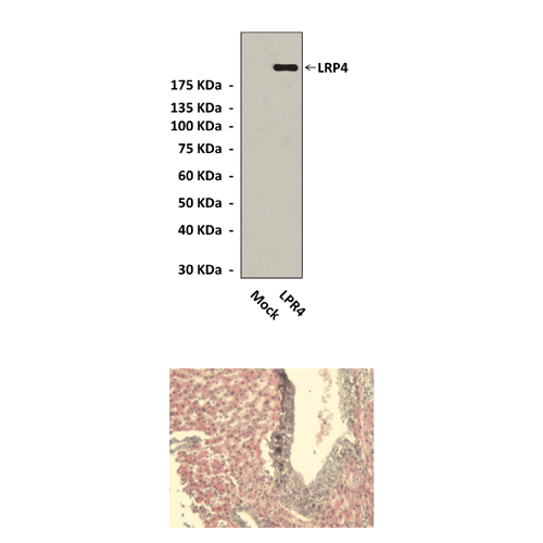 Top: Western Blot detection of LRP4 protein in lysates from 293T cells transfected with mock or human LRP4 expression vectors (kindly provided by Dr. Lin Mei, Medical College of Georgia) using LRP4 Antibody. Bottom: This antibody stains paraffin-embedded human hepatoma tissue in immunohistochemical analysis.