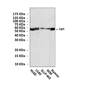 Lyn, one of several Src-family tyrosine kinases in immune cells, has two isoforms p53Lyn and p56Lyn, resulting from alternative splicing of Lyn mRNA. It is preferentially expressed in B cells as well as other hematopoietic cells, but not in T cells. Lyn is noted for its ability to negatively regulate signaling pathways through phosphorylation of inhibitory receptors, enzymes, and adaptors. Somewhat paradoxically, it is also a key mediator in several pathways of B cell activation, such as CD19 and CD180. Whether Lyn functions to promote or inhibit immune cell activation depends on the stimulus and the developmental state, meaning that the consequences of Lyn activity are context dependent. The importance of regulating Lyn activity is exemplified by the pathological conditions that develop in both lyn-/- and lyn gain-of-function mice (lyn up/up), including lethal antibody-mediated autoimmune diseases and myeloid neoplasia.3